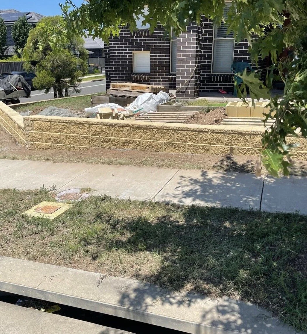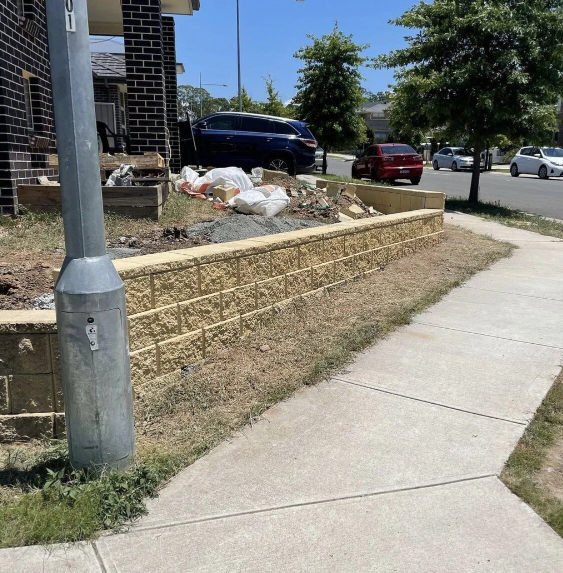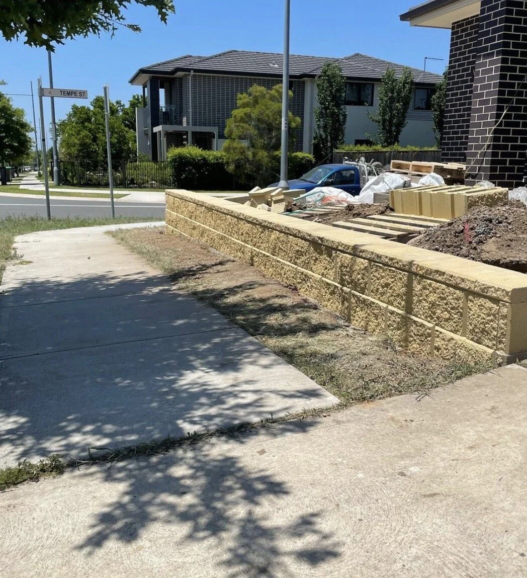 Garden wall in Cream Tasman Block. Supply and install with concrete footings finished with a capping.