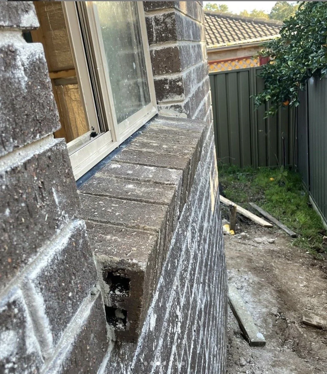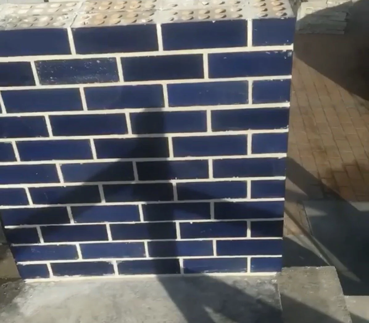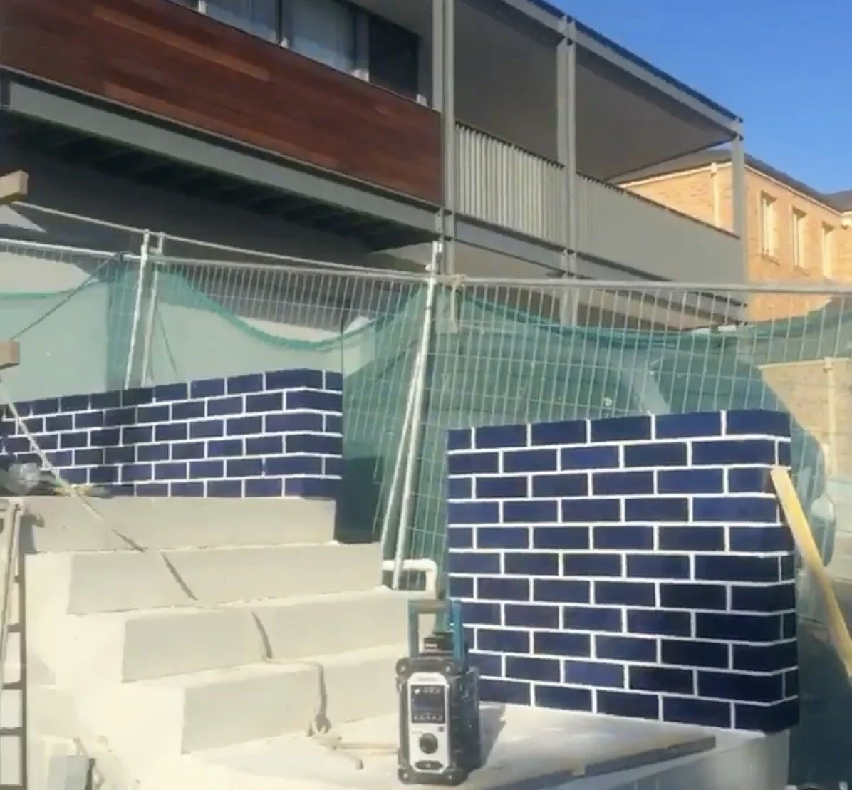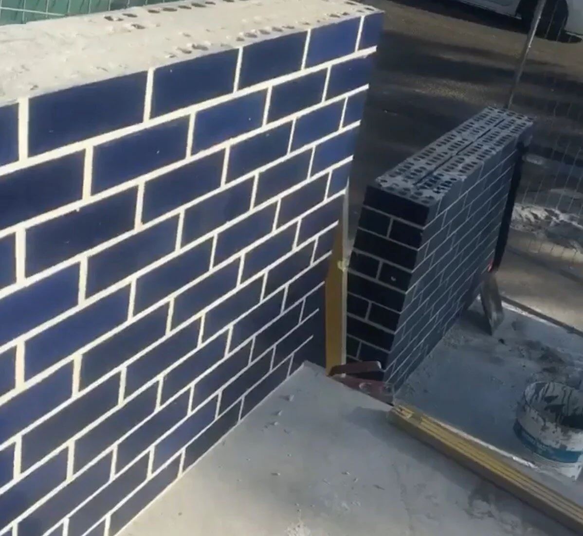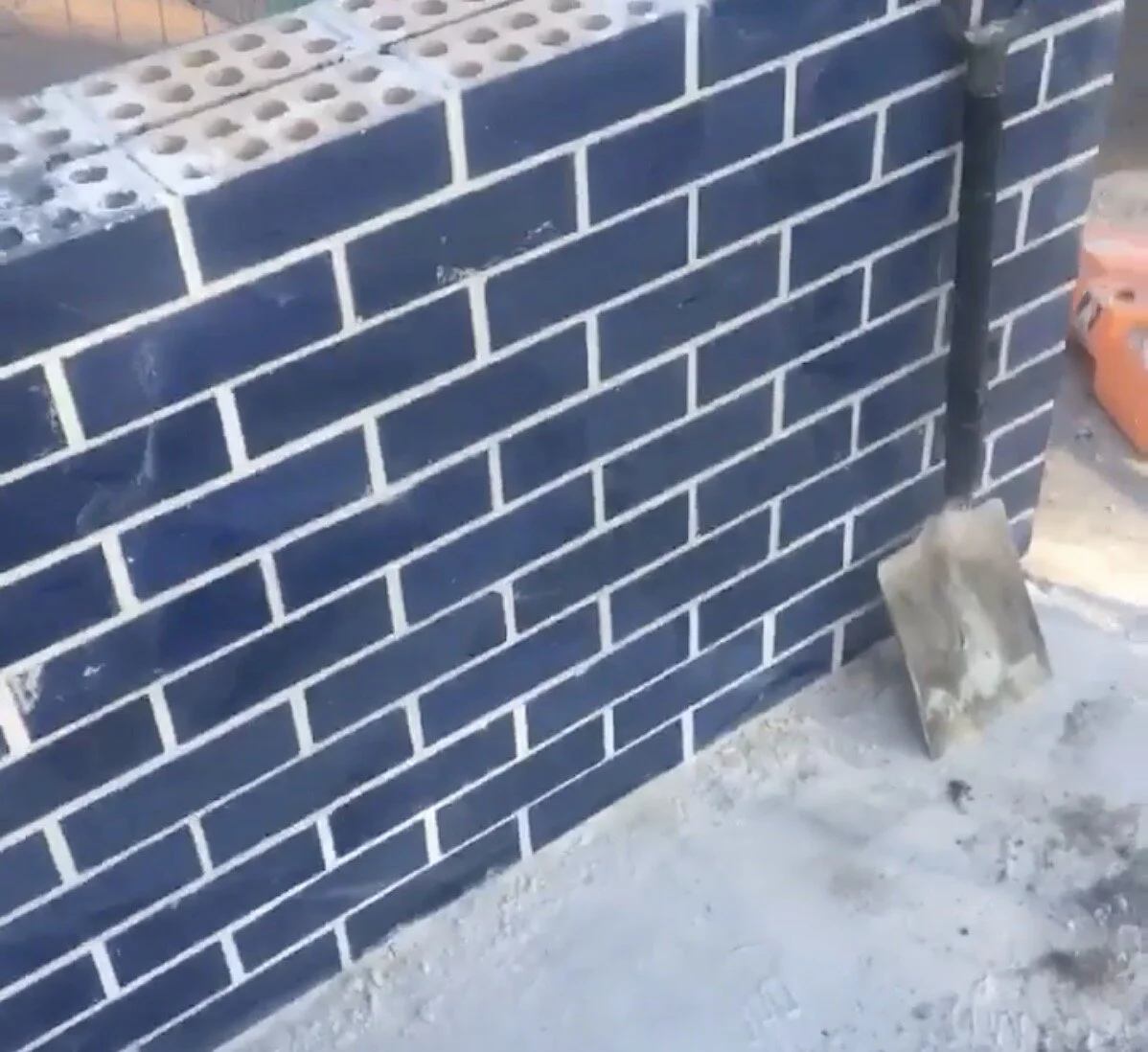 Step down finish Austral Blue Glazed Face Brick. Mortex cement with a flush sponge finish.