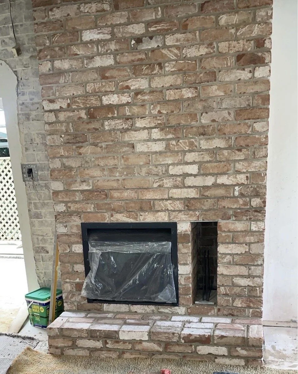 Outdoor fireplace in standard red face brick. Indoor fireplace in recycled brick with a round iron finish supply and install.